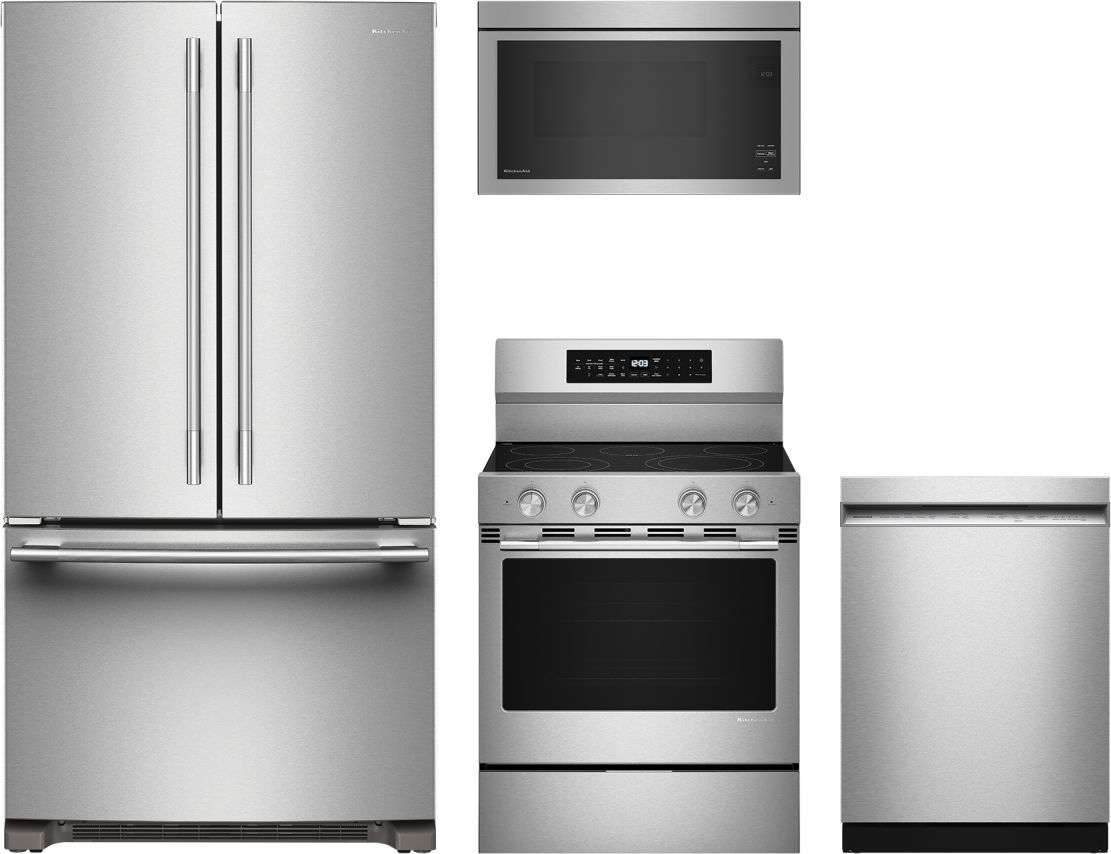 KitchenAid® 4-Piece Stainless Steel Kitchen Package with 36" French Door Refrigerator, Third Level Utensil Rack Dishwasher, Smart Freestanding Electric Range and Over-The-Range Microwave.Read More