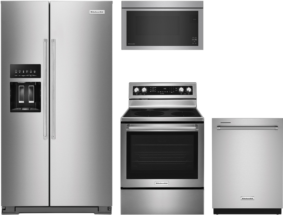 KitchenAid® 4 Piece Stainless Steel Kitchen Package with a side-by-side refrigerator, free standing electric range, over the range microwave and built in dishwasher.Read More